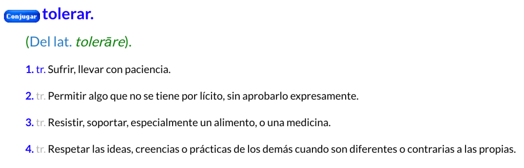 Odio el uso de esta palabra. Es un cáncer. Según el diccionario de la RAE, “tolerar” significa lo siguiente: