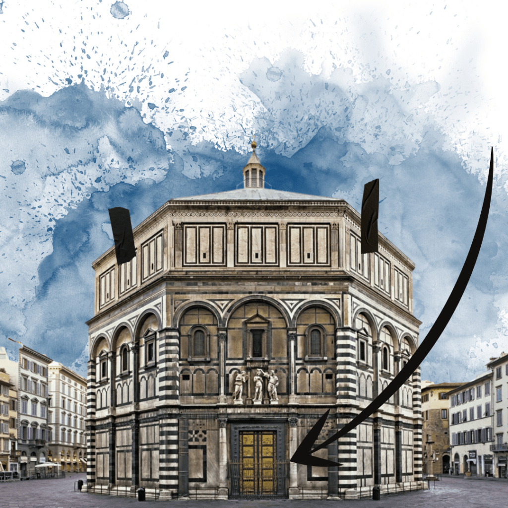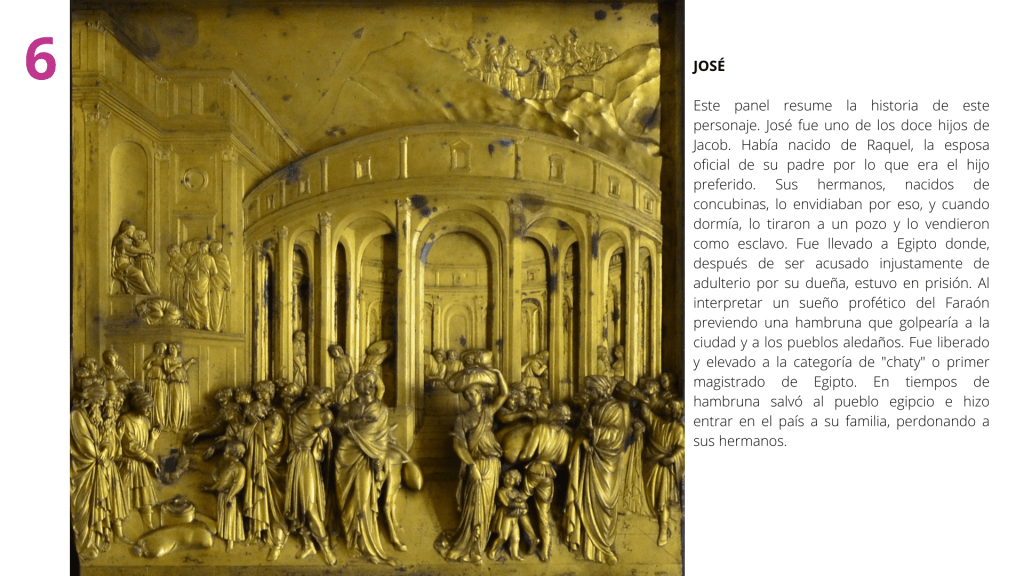 Primero, un poquito de historia. La Puerta del Paraíso de la que hablaremos no fue su primera obra para el baptisterio de San Juan, sino el segundo proyecto que hizo. Este edificio octagonal tiene tres juegos de puertas: las del lado Este, Sur y Norte. La primera puerta fabricada e instalada en frente de la entrada al Domo, fue realizada por Andrea Pisano; el proyecto empezó en 1329 y terminó en 1336 y cuenta con 28 paneles, los 20 paneles superiores representan escenas de la vida de San Juan Bautista, y los ocho paneles inferiores retratan las virtudes (esperanza, fe, caridad, humildad, fortaleza, templanza, justicia, y prudencia).