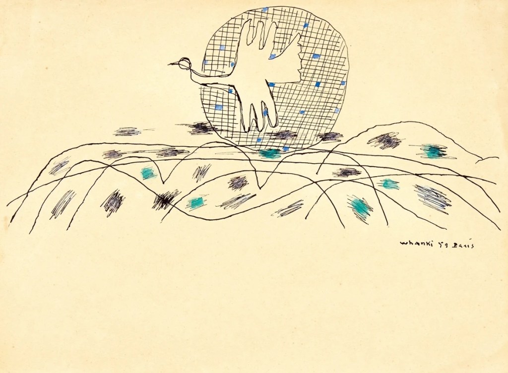 Después de tres años en un campo de refugiados, sin saber francés, el matrimonio se mudó a París. Aunque pasó ahí una corta temporada, fue ahí que empezaría a usar el color azul que tanto lo identificaría. Llamado el “azul Whanki” o el “color del hogar”, este tono lo era todo para él: la sensación de su tierra, el mar de la península, la textura del cielo.