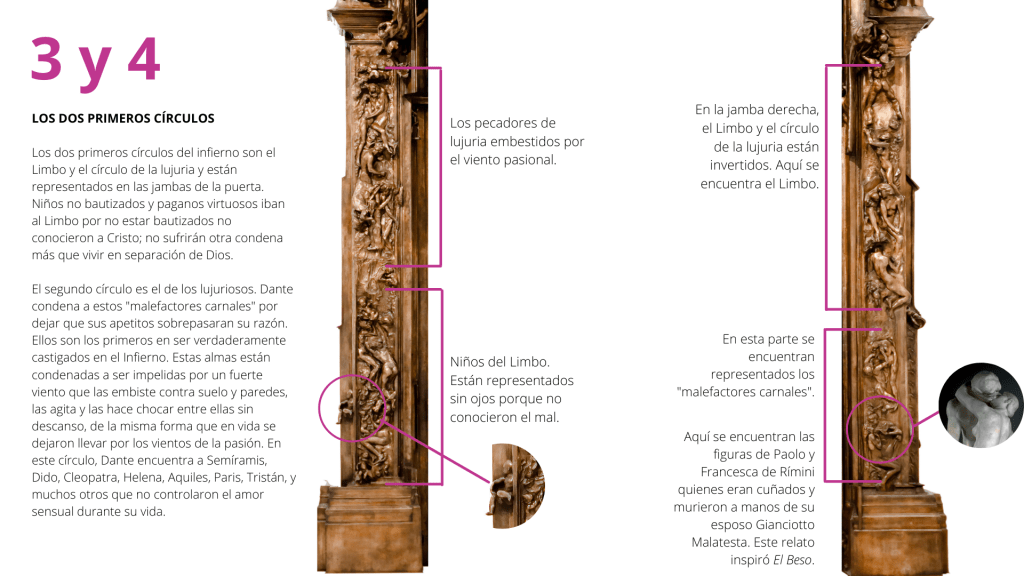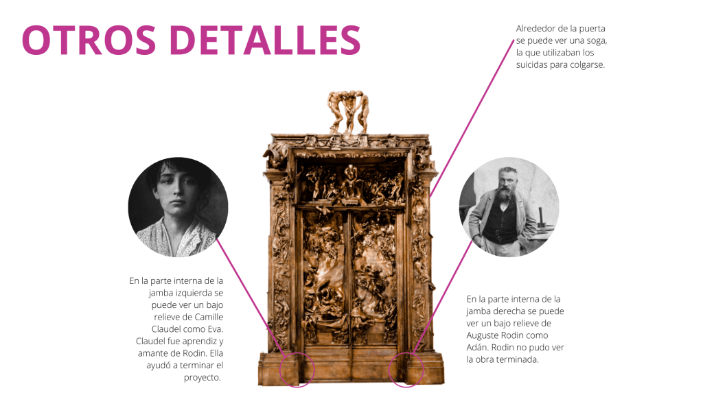 Además de las inspiraciones italianas previas, Rodin se ayudó de obras como Las Flores del Mal de Charles Baudelaire, no sólo por el contenido del poemario sino por su estructura parecida a la de un itinerario moral, espiritual y físico que exaltaba el goce de las pasiones –de hecho, antes iba a tratar de los pecados capitales–; de la parte del Infierno de La Divina Comedia; y de algunos de los mitos encontrados en La Metamorfosis de Ovidio.