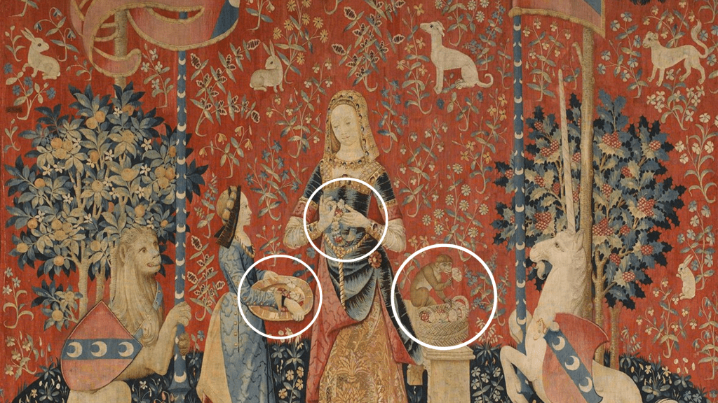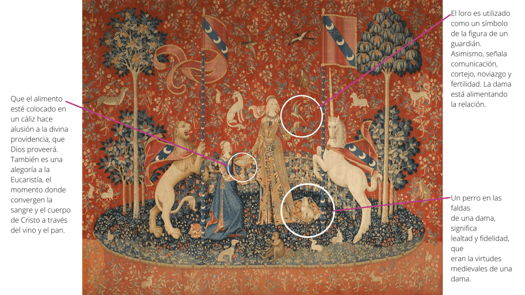 En su conjunto, en una lectura rápida, simbolizan a los cinco sentidos: el gusto, el oído, la vista, el olfato y el tacto. Adentrándonos a la profundidad del mensaje, la iconología señala una alegoría al amor cortés, tan popular en esa época, como una alegoría escatológica a la nación (escatología del estudio teológico del destino último del ser humano y el universo, no del destino último de la comida).