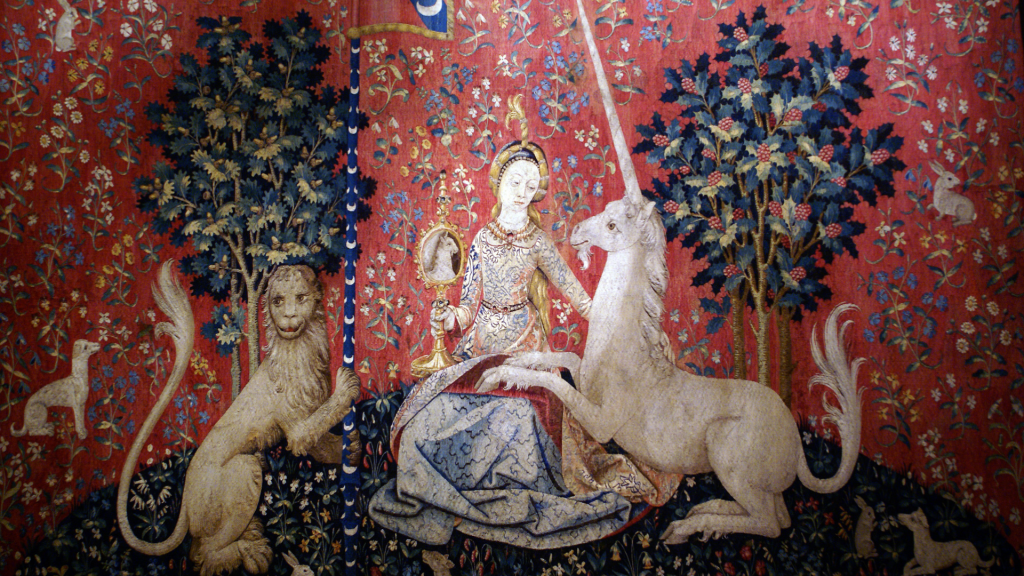 En el Museo de Cluny, también conocido como el Museo del Medioevo, se encuentran seis tapices tejidos en lana y seda llamados «La dame à la licorne» o «La dama con unicornio». Provenientes de un taller de Flandes, su dibujo francés retrata la máxima moda europea de los siglos XIV y XV: la de los unicornios.