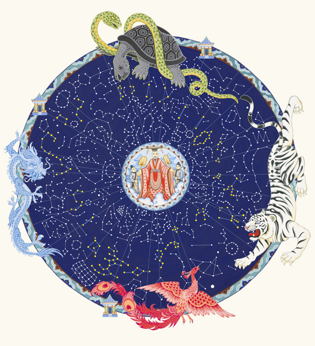 La bóveda celeste está protegida por cuatro guardianes, conocidas como las cuatro bestias sagradas. Estas se encargan de resguardar a las constelaciones de origen chino, que a diferencia de los diversos grupos de estrellas de occidente, se dividen en tres grandes recintos y en 28 casas. A diferencia de las 12 casas del zodiaco que conocemos y que se basan en la relación de la Tierra con el Sol, las casas chinas están basadas en los movimientos lunares.