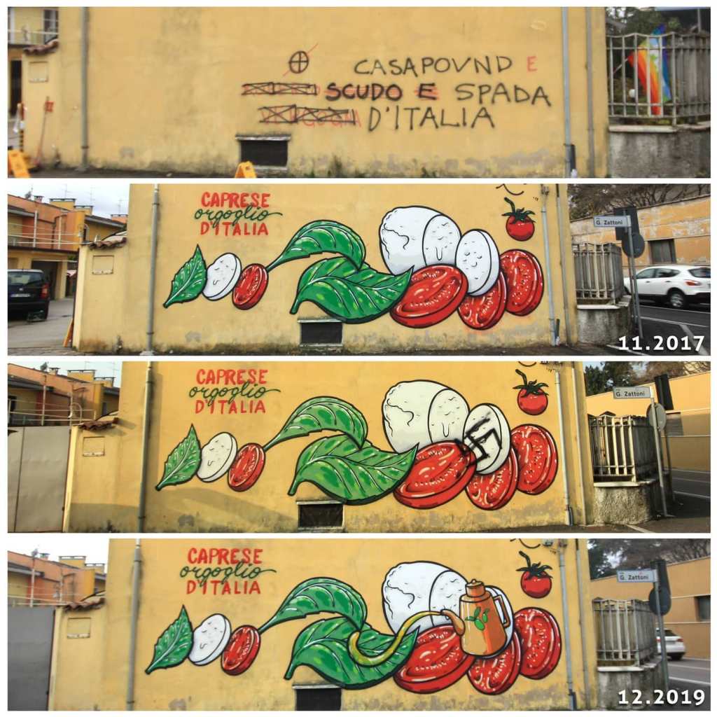 El miedo a que “los italianos de verdad” se diluyan entre extranjeros indeseados crea un odio que se manifiesta en graffiti con símbolos de esvásticas, cruces celtas y tortugas de Casapound usados por grupos fascistas y de ultraderecha. Hacer esto en paredes públicas con alta circulación busca crear un sentido de terror que señala que los extraños no son bienvenidos, generando violencia, odio e inseguridad.