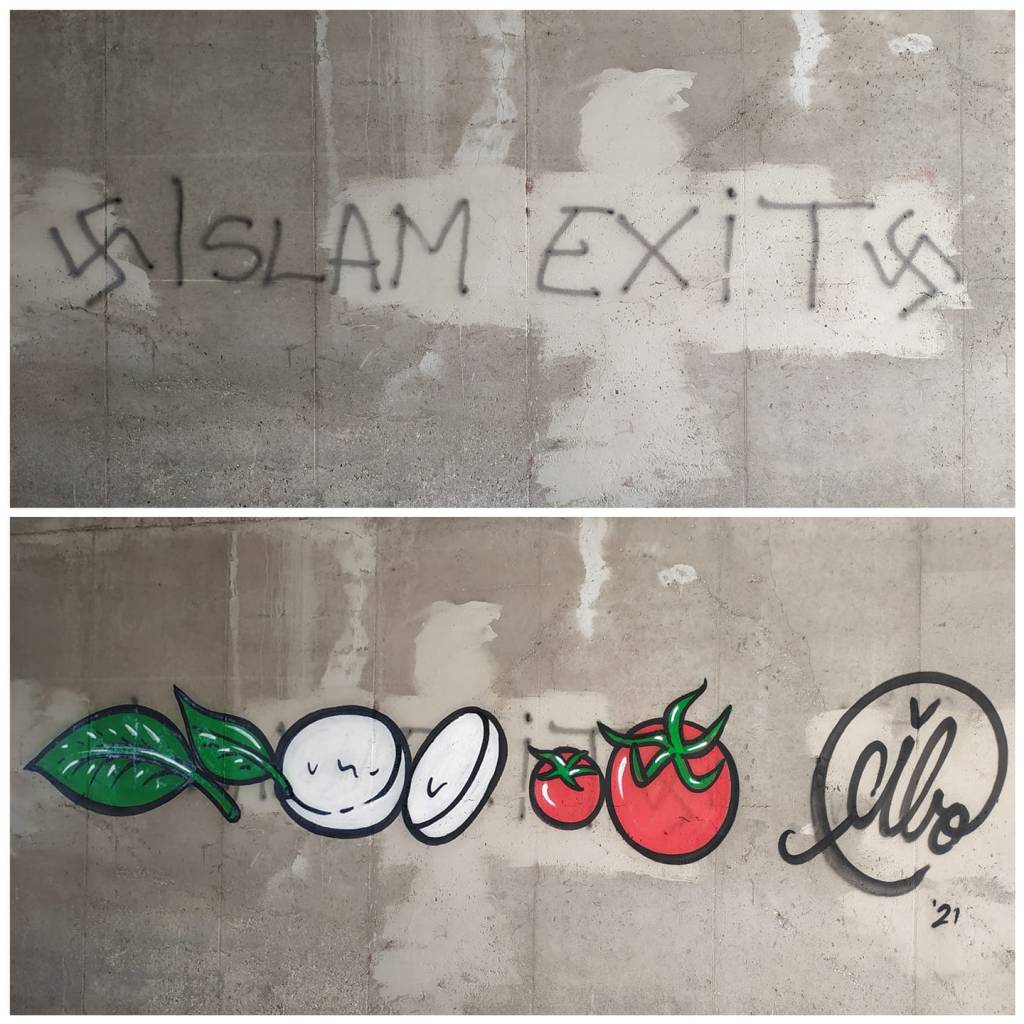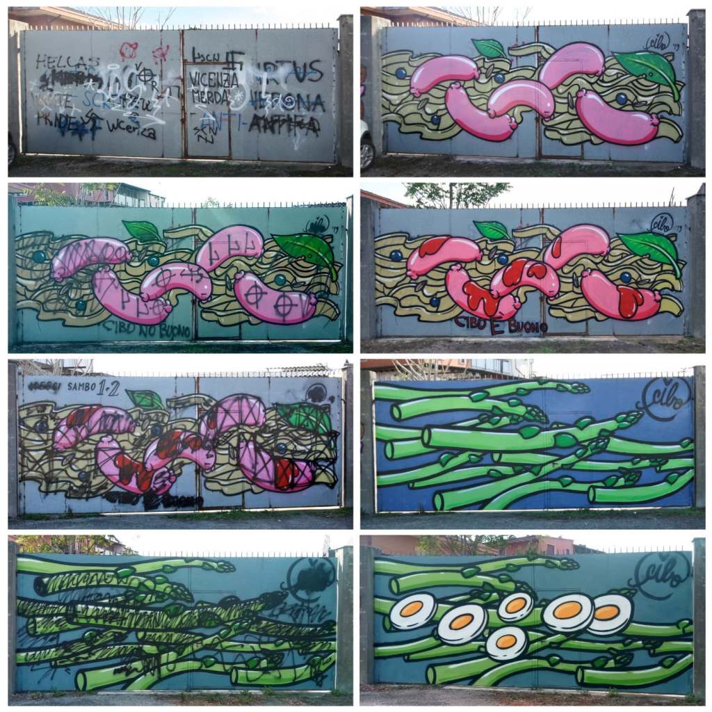 ¿Cómo se puede luchar con un graffiti así? Con otro graffiti. Pier Paolo Spinazzè (1981) es un artista que usa el street art para luchar contra el odio. Su nombre artístico es CIBO –“comida” en italiano–, y cada que pasea por Verona y ve pintarrajadas racistas, las corrige con hermosos murales inspirados en comida italiana.