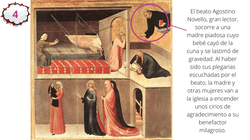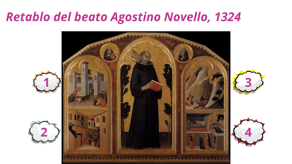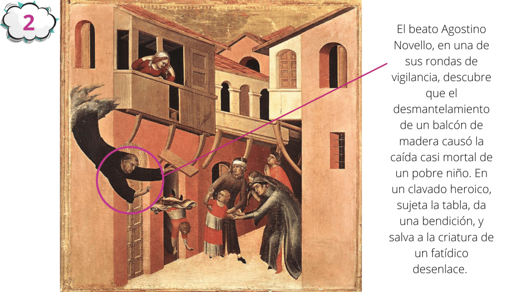 Simone Martini (1284-1344), y Stefano di Giovanni (1392-1451) –mejor conocido como Sassetta–, fueron pintores italianos que durante la época gótica medieval retrataron a numerosos santos, entre ellos a dos súper santos, a los beatos Agostino Novello y a Ranieri Rasini, respectivamente. Con líneas elongadas y fondos dorados, estos artistas representaron las extraordinarias capacidades salvadoras de dos hombres de Dios.