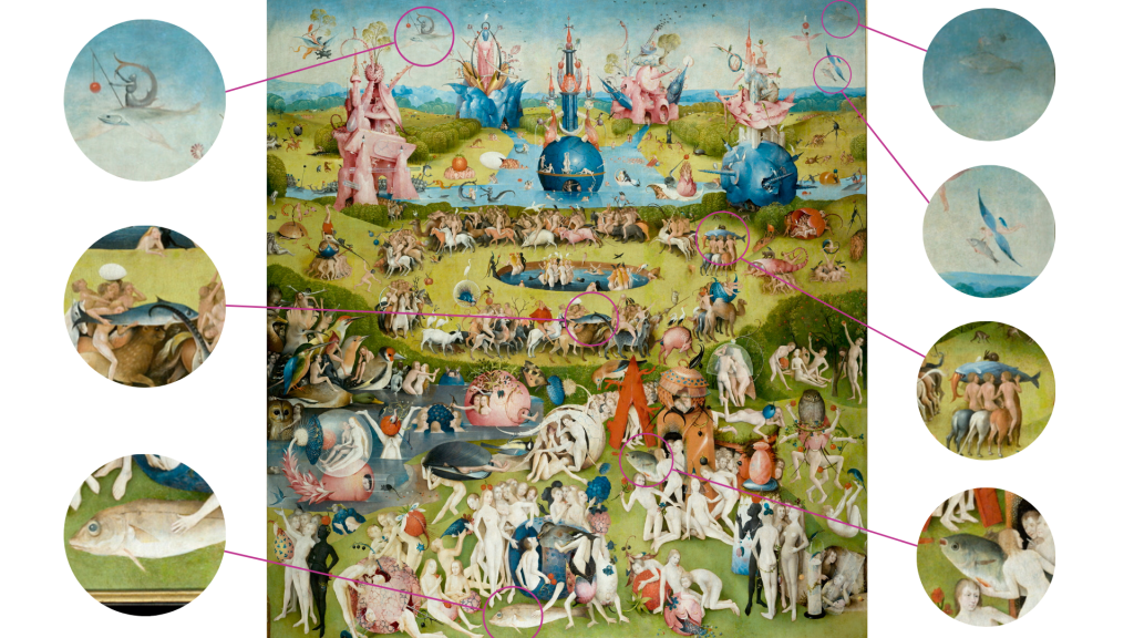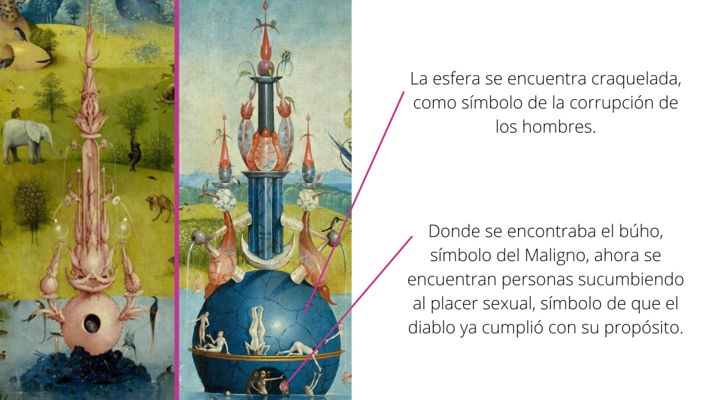 Existen varios elementos que se repetirán como acontecimientos y elementos que han provocado la desgracia humana. Recordando los tiempos en los que vivía el artista, el imperio musulman se estaba expandiendo; El Bosco retrata esta amenaza a la fe cristiana con medias lunas y con personas de tez oscura –una representación un tanto racista que buscaba el contraste evidente– coexistiendo y propiciando las parejas birraciales para corromper el ejemplo de Cristo. Los búhos siguen apareciendo, como enviados del Diablo y testigos del pecado; en el panel anterior sólo había uno, y en este hay varios más. Por último, los peces fuera del agua denotan caos, mostrando cómo el universo perdió el orden por culpa del pecado.