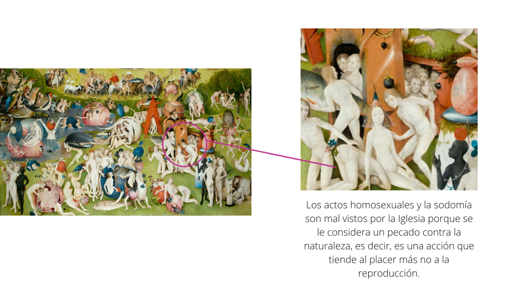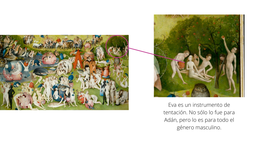 Por cuestiones de interpretación masculina de los textos sagrados, se han confundido los términos de tentación con lujuria, pecado capital por pecado carnal, haciendo que Eva –y por ende, las mujeres en general–, se vean como las responsables de seducir al hombre a pecar a través del sexo. En época de El Bosco (1450-1516), la fornicación era una de las faltas más graves a Dios y a la sociedad, por lo que su obra busca ser una crítica a la promiscuidad.