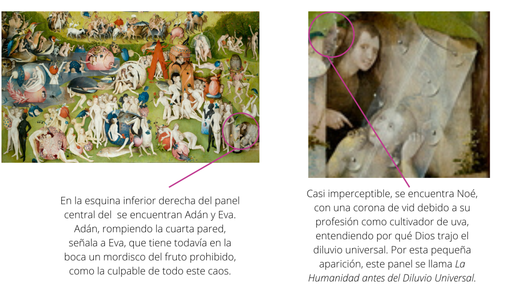 El Bosco juega con el tiempo en el segundo panel, debido a que la humanidad sigue en el jardín del Edén después que Adán y Eva sucumbieron a la tentación. Normalmente, según la Biblia, el primer hombre y la primera mujer fueron desterrados del Paraíso por lo que ninguna otra persona lo pudo conocer, pero aquí, el artista quiere hacer una obra que permita la conversación sobre las faltas que hicieron enojar a Dios.
