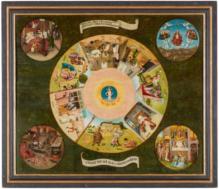 Alrededor del círculo, se encuentran siete escenas de la vida cotidiana de Flandes que representan a cada pecado capital, Ira, Soberbia, Lujuria, Pereza, Gula, Avaricia y Envidia. Estos mismos se ven representados en animales, muchas veces montados por hombres, en La Humanidad antes del Diluvio Universal.