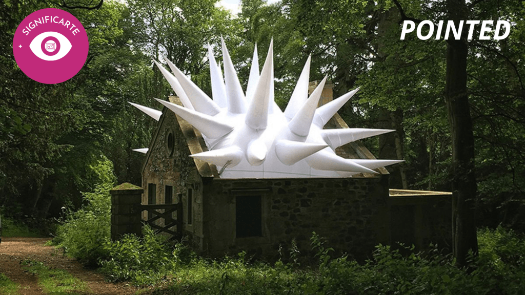 Pointed (2017) llena el vacío de la cabina de entrada de Mellerstain House, una construcción escocesa diseñada por Robert Adam en el siglo XVIII. Aprovechando la carencia de techo, 28 picos alargados y dinámicos se elevan más de tres metros en el aire, que recuerdan un estallido estelar o una explosión estilizada congelada en el tiempo. Combinando características históricas con prácticas escultóricas audaces y contemporáneas a gran escala, el artista establece un diálogo vivo entre el pasado y el presente, agregando una nueva dimensión inesperada y temporal a las vistas y la arquitectura familiares. El inflable blanco recuerda las esculturas de mármol usadas como decoración, jugando con nuevas narrativas y dándole un poco de magia al lugar.