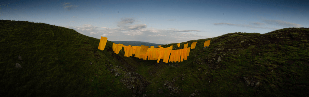 Hush (2019) fue instalada en el paisaje remoto de North Pennines, County Durham, Reino Unido. Las vastas tierras altas abiertas tienen una rica historia llena de cicatrices que recuerdan que, hace 250 años, la mayor parte del plomo del mundo salió de las minas de esas colinas. Messam decoró esta tierra con más de 600 enorme banderas de color amarillo azafrán, suturando el explotado paisaje con color, sonido y movimiento para transformar la antigua característica industrial.La instalación –que suró sólo 16 días–, contaba con 370 m de largo, 50 m de ancho y 45 m en su punto más alto, y utilizó más de 5 km de tela para hacer la obra de arte.