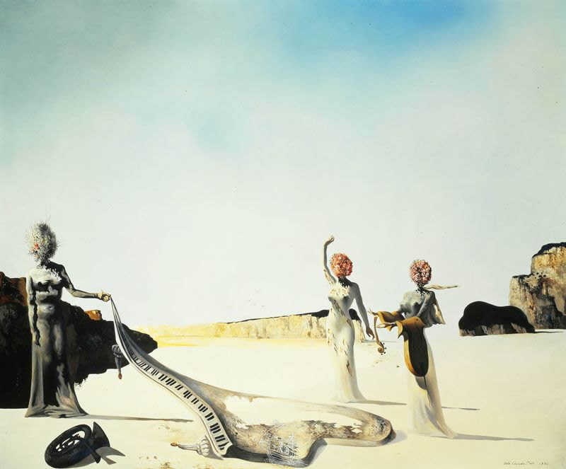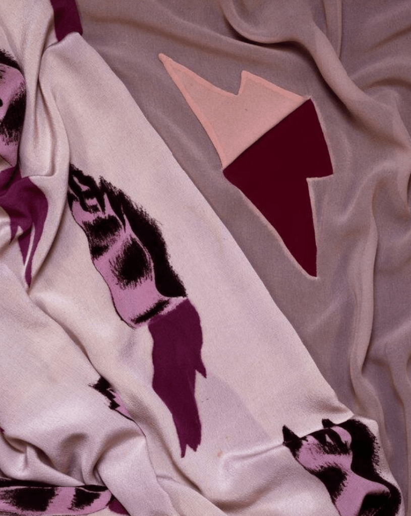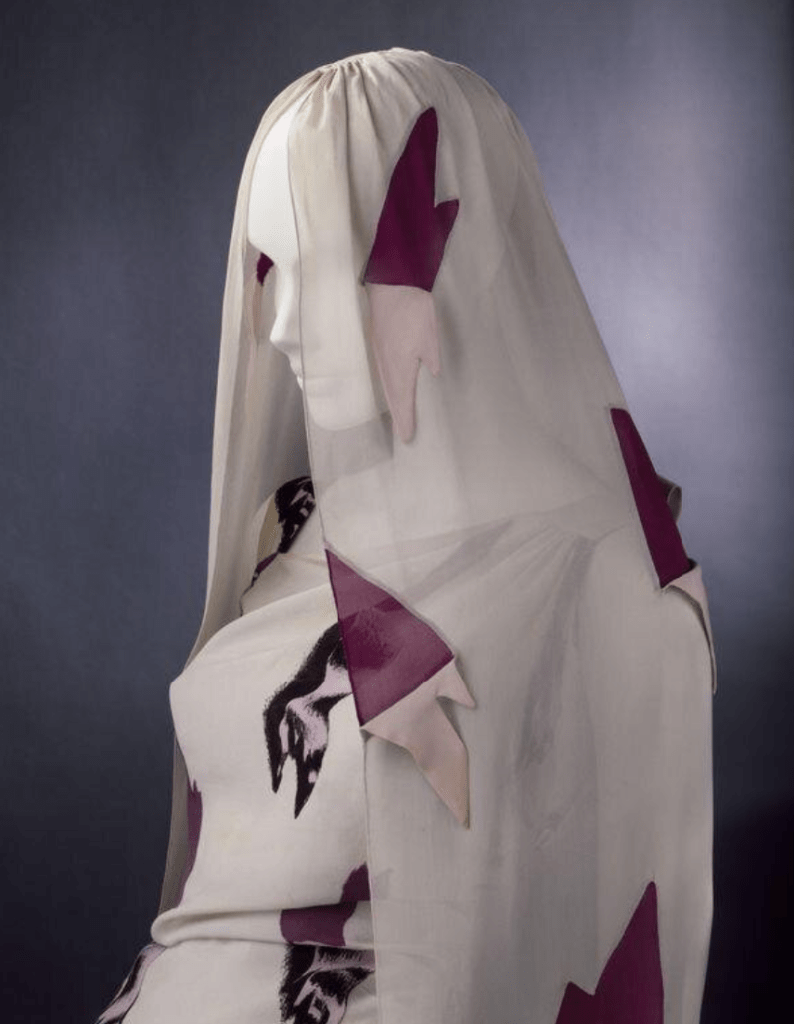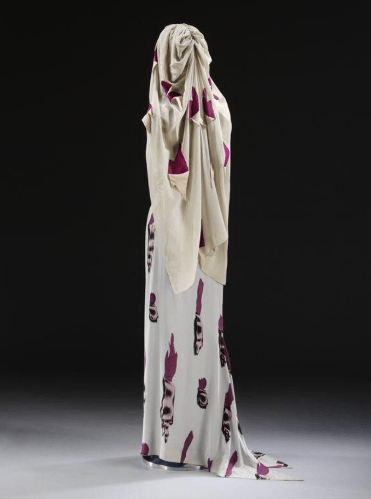 La otra prenda que llamó la atención de esa colección fue el vestido rasgado, o el vestido que llora, inspirado en Lágrimas de Man Ray y en una de las mujeres del cuadro Tres jóvenes mujeres surrealistas que sostienen en sus brazos las pieles de una orquesta. Estampado por Dalí, está hecho de viscosa, rayón y seda cuyas lágrimas semejan jirones o trozos de carne desgarrados. El velo a juego incluye el mismo motivo pero, en lugar de un estampado, presenta tiras de apliques que cuelgan y desvelan una capa de color rosa oscuro.
