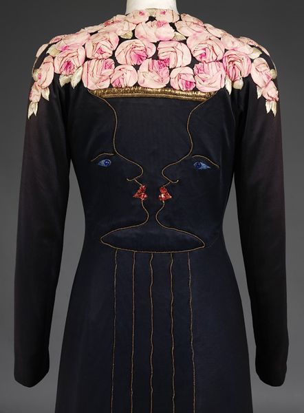 Jean Cocteau (1889-1963) fue un escritor y diseñador francés y dibujó para Schiaparelli un par de cabezas que ella integró a algunos de sus modelos. Uno de los más conocidos es un abrigo de noche. En la parte trasera de éste figuran los perfiles de dos caras bordadas en hilo metálico que dibujan la silueta de un jarrón con rosas, el cual reposa sobre una columna central. Las labores de bordado se encargaron a la Maison Lesage, uno de los talleres artesanales parisinos más destacados del sector de la alta costura. Las rosas, que caen por los hombros de la prenda están hechas de cinta en distintos tonos de rosa y se intercalan con hojas bordadas con hilo de seda a punto satén de color verde pálido. Por delante, el abrigo es completamente liso, presenta unas solapas simples y se abotona a un lado con un botón que representa una falda de volantes levantada de donde salen unas piernas de mujer con los pies en punta.