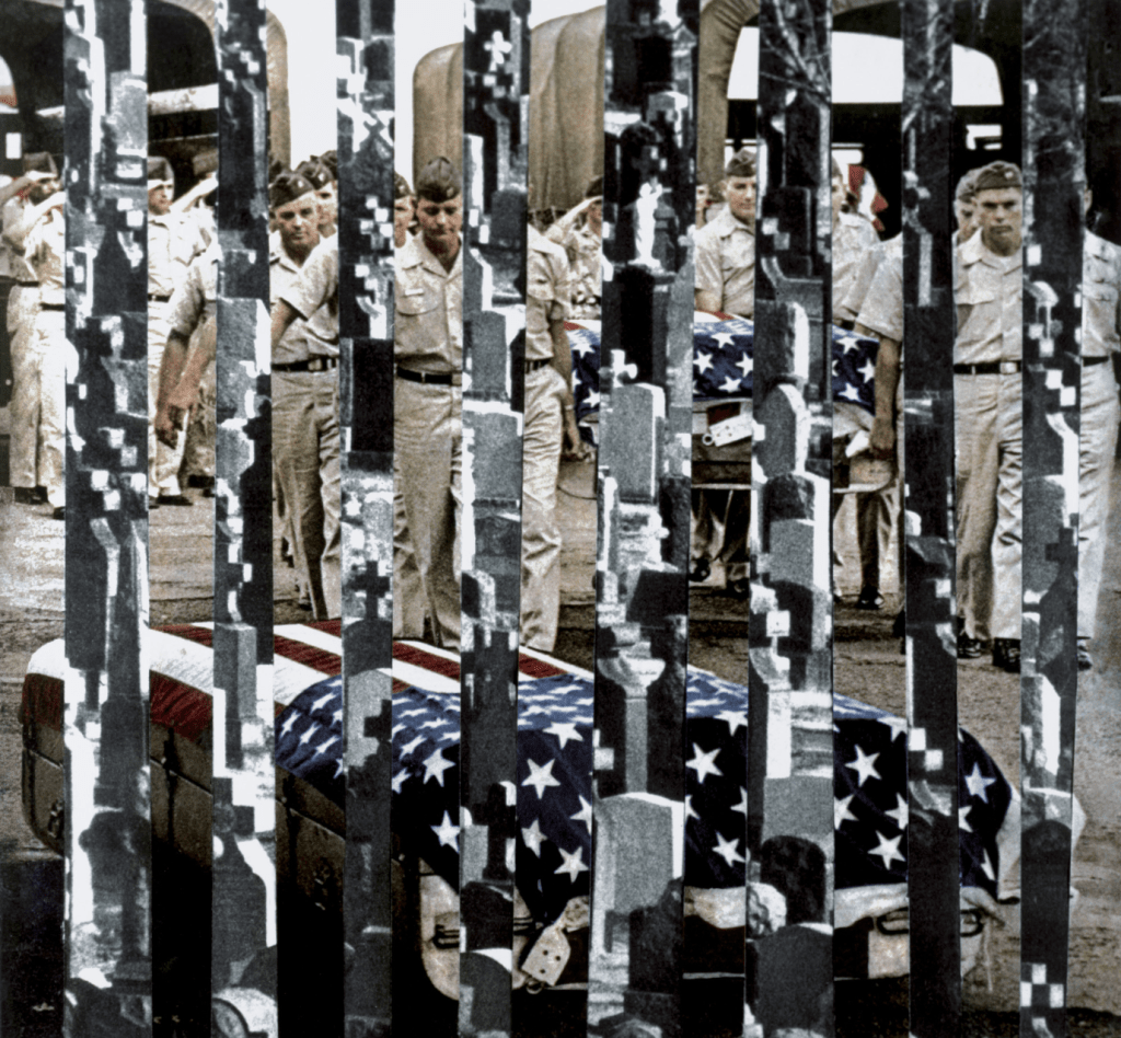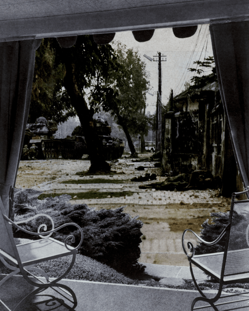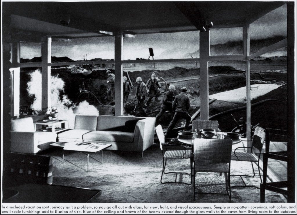 El resultado era abrumador. En una cocina lujosa se podían ver vietnamitas mutilados. En una escena de una ama de casa estrenando una aspiradora especial para cortinas, se asomaba una trinchera estadounidense por la ventana. En un jardín glamouroso, soldados descansan al sol. La serie de montajes se llama House Beautiful: Bringing the War Home, y realmente trajo la guerra lejana, a la cotidiana sala de estar.