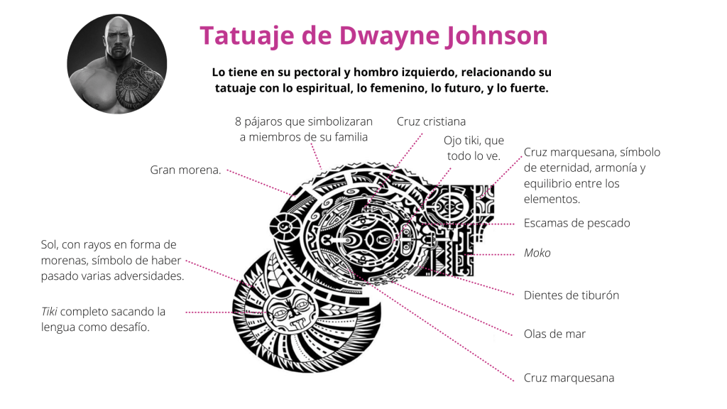 Una de las figuras polinesias contemporáneas más famosas es Dwayne “The Rock» Johnson. En su tatuaje pectoral se pueden ver algunos de los símbolos más comunes descritos anteriormente. Analizando su tatuaje se puede ver que vivió muchas adversidades que logró superar a lo largo de su vida debido a la gran cantidad de barracudas completas y simplificadas que tiene tatuadas. Usa su tatuaje como protección y como símbolo de fuerza y equilibrio en miras al futuro.